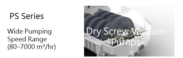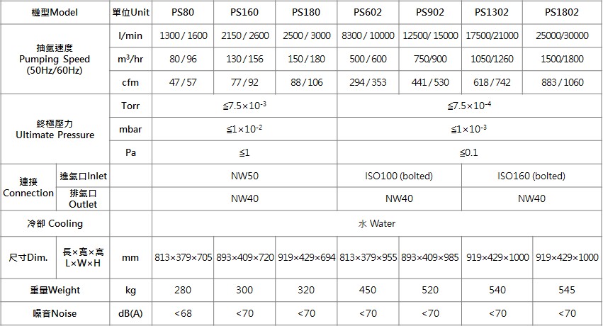 乾式螺旋真空泵浦的型號有: PS80、PS160、PS180、PS602、PS902、PS1302、PS1802 PS系列乾式螺旋真空泵浦的特色有: